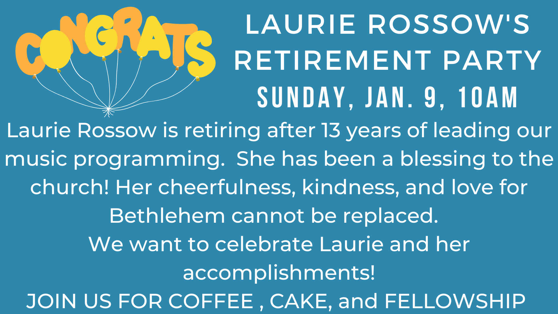 Laurie Rossow is Retiring! We hope you will join us on the 9th to celebrate Laurie’s immense contributions to Bethlehem. Bethlehem LutheranDecember 20, 2021Comment Facebook0 Twitter LinkedIn0 Reddit Tumblr 0 Likes