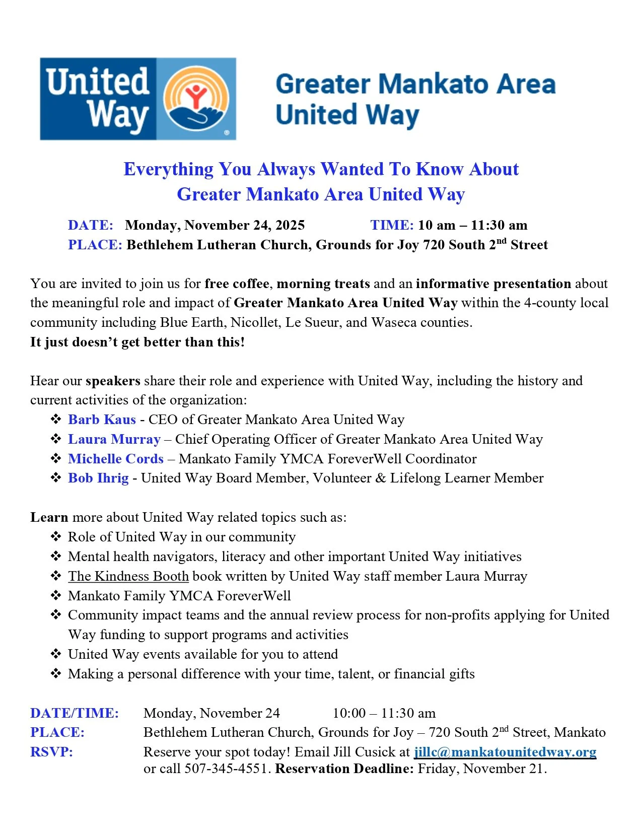 Greater Mankato Area United Way Gathering: Join us on Monday, November 24 at 10am in Grounds for Joy to learn what the Greater Mankato Area United Way is doing to make a difference in our 4 area counties. Enjoy coffee and morning treats as you hear from representatives of United Way. Check out details below. Please RSVP as directed by Friday, November 21.