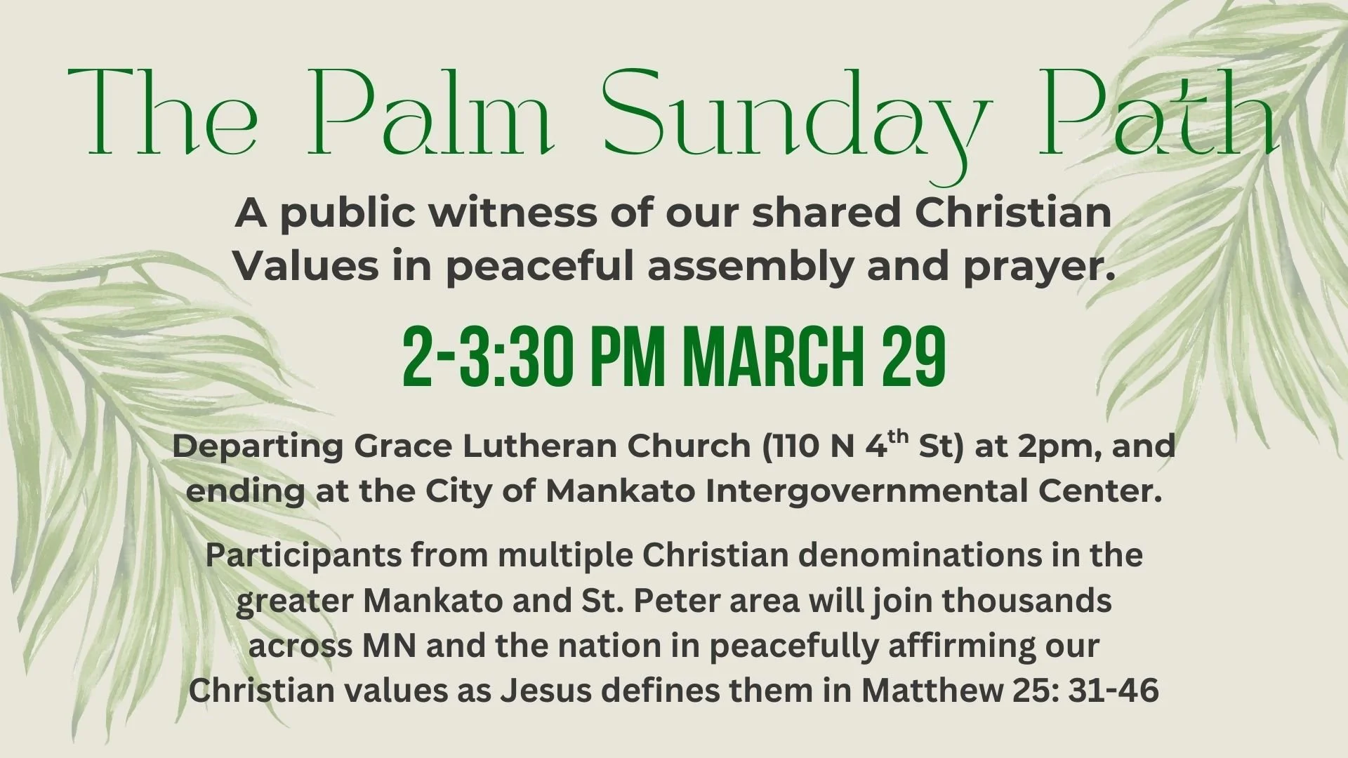 Bethlehem members are invited to join an ecumenical Palm Sunday Path next Sunday afternoon. Area Christians are invited to gather and affirm their Christian values as Jesus defines them in Matthew 25:31-46 on this prayer walk. We will depart from Grace Lutheran Church at 2pm and walk to the City of Mankato Intergovernmental Center.