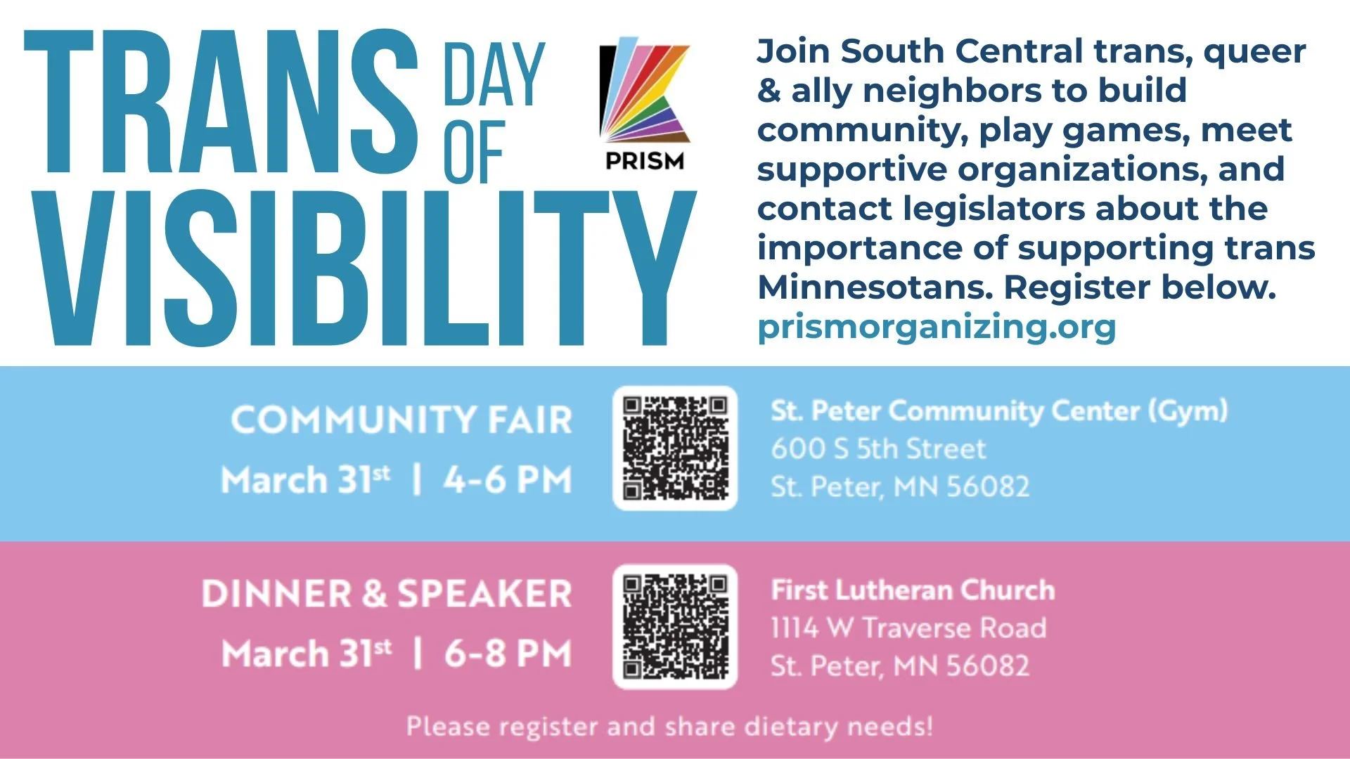Tuesday, March 31, is the Trans Day of Visibility. All are welcome to join PRISM for a Community Fair, Dinner and Speaker in St. Peter tomorrow evening. More information is available at prismorganizing.org Register online.