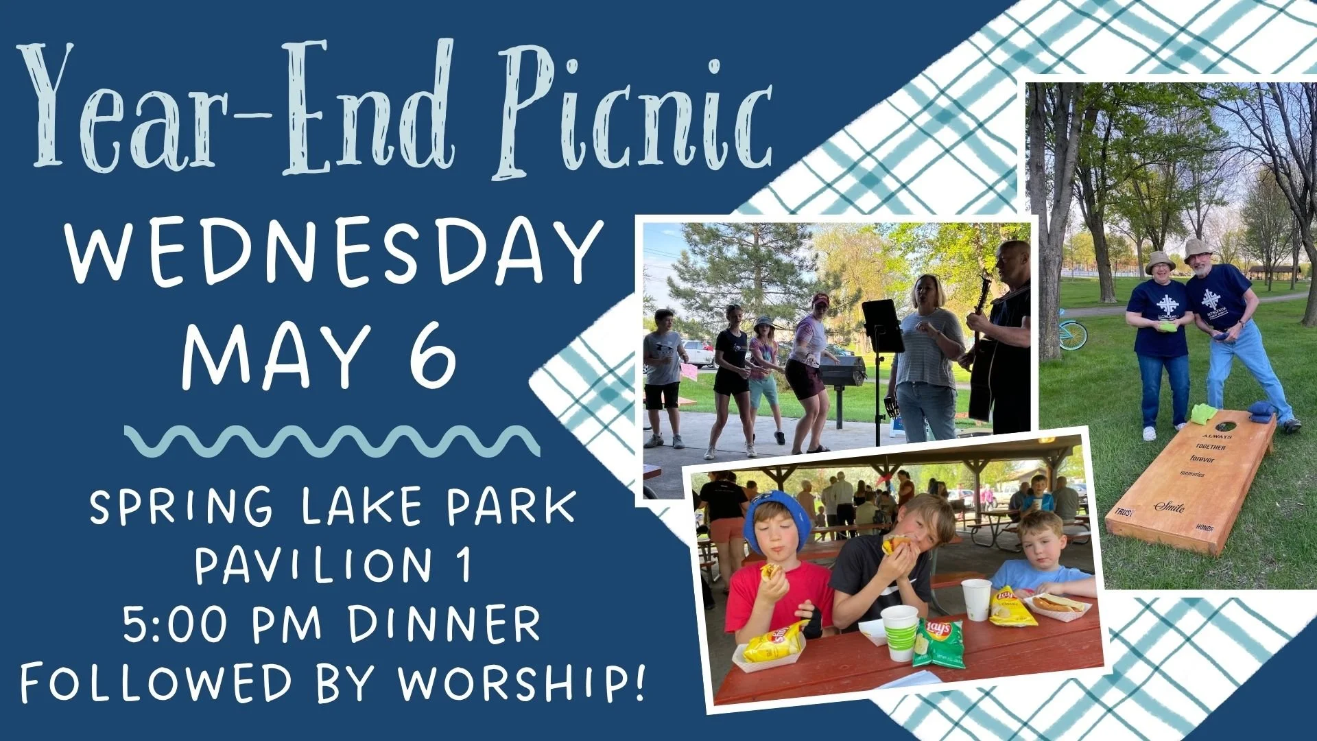 The Year-End Picnic is next Wednesday! Join us at Spring Lake Park for supper, worship, and fun!