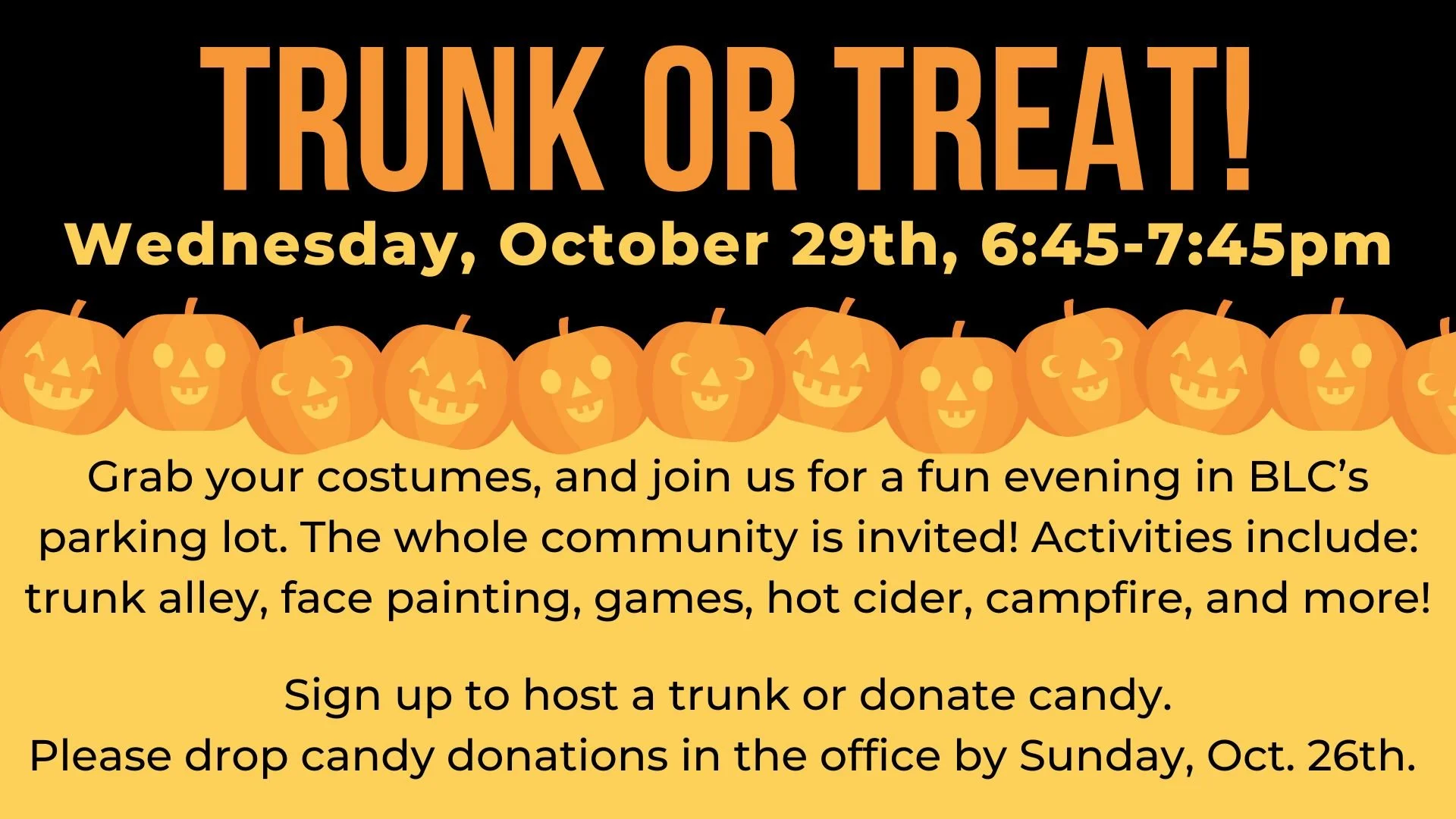 Trunk or Treat is October 29th! Grab your costumes and candy bags and join us for trunk alley, face painting, hot cider and more. Sign up online to host a trunk or to donate candy!